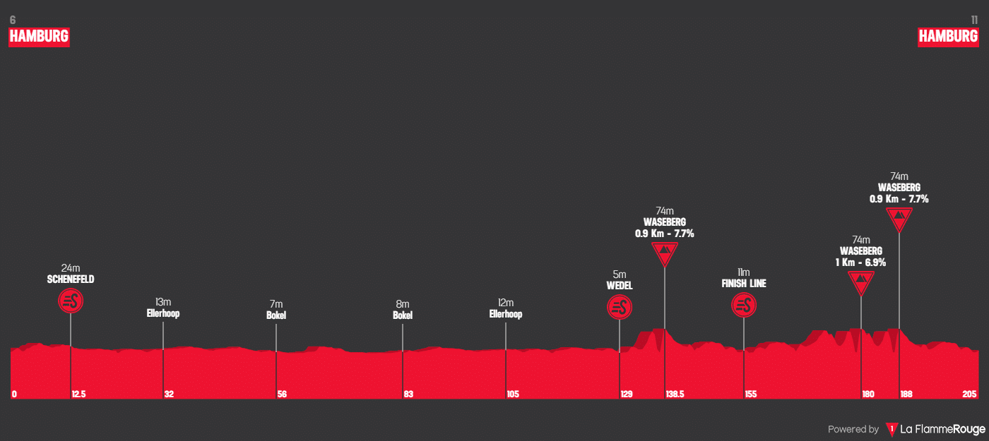 The climb summits with 67.5, 25 and 17 kilometers to go. The final two ascents will be separated by a very short distance, allowing for tactics and aggressive racing to develop. After going through them however, it will be a flat run-in back to the center of Hamburg and into a likely sprint.