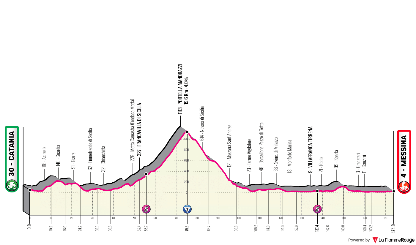 From Messina to Catania. The fifth day of racing is the second of two in Sicily, and it’s a very interesting stage which can see different scenarios succeed. Not a brutal day, but the first half of the stage is relatively hard and can see a dangerous group go up the road. The first kilometers of the stage are very rolling, and the peloton will then go up a long ascent.