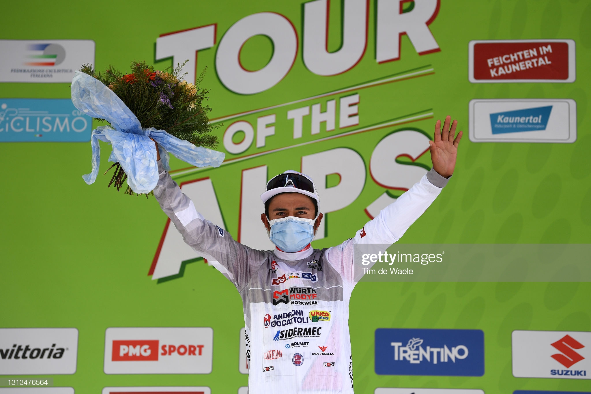 Alexander Cepeda se lució en la segunda etapa del Tour de los Alpes 2021, al arribar con el primer grupo perseguidor y enfundarse la camiseta de líder de los jóvenes en la general. El joven escalador buscará finalizar la prueba alpina con el maillot blanco.