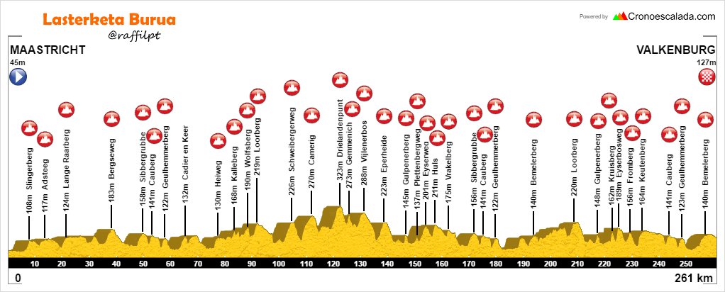 The Amstel Gold race is a brutal test of endurance. Despite being 261km long, the road is never flat, the peloton are constantly climbing or descending. The lack of “down time” adds to the general feeling of fatigue, making this a true test of stamina. The 35 hills are not long, but some are steep.