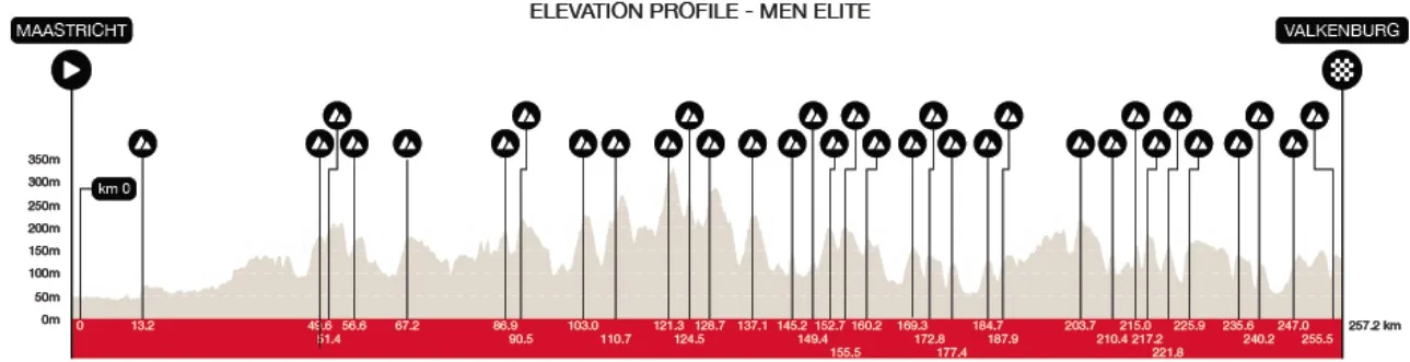Durante prácticamente todo el recorrido los ciclistas estarán subiendo o bajando. Nuevamente, acá no hay grandes puertos sino que el desgaste es progresivo y constante al superar una tras otra las colinas de esta región de Países Bajos. A diferencia de otras grandes clásicas, aquí no hay un largo prólogo en llano. La carrera entra rápidamente en ese terreno ondulado que define su identidad, y desde ahí todo es un continuo sube y baja. Por esto, es una carrera muy difícil de controlar y la lectura de carrera es muy importante ya que calcular mal un ataque o hacerle la carrera al rival son errores mucho más fáciles de cometer cuando se tiene que gestionar el esfuerzo en este mar de colinas.