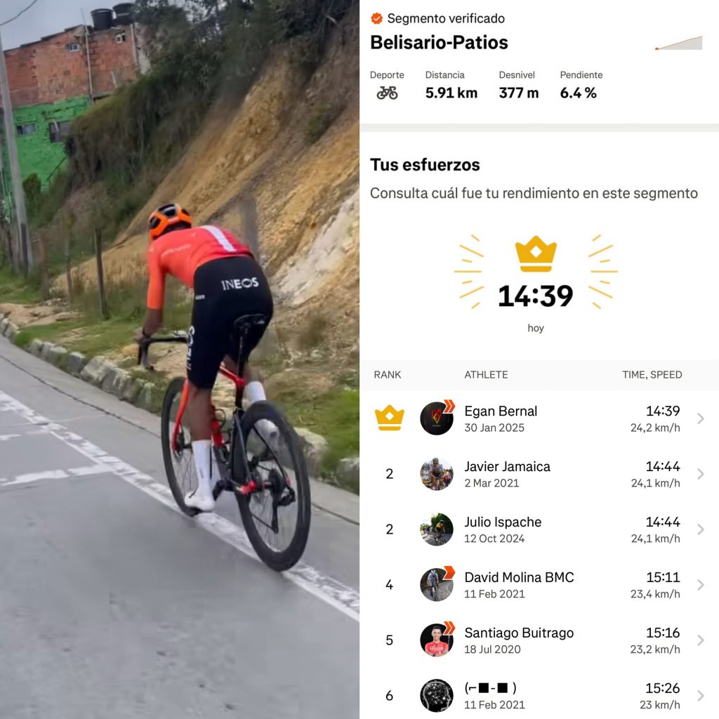 Días atrás, Bernal batió el récord en Strava de la subida del Alto de Patios en Bogotá, uno de los puertos de montaña más emblemáticos de esa ciudad. Se trata de un ascenso de 5,91 kilómetros al 6,4% de desnivel y una altitud de más de tres mil metros en su coronación. Lo hizo con una velocidad media de 24,2 kilómetros por hora y marcó un promedio de 360 vatios, lo cual daría 6 vatios por kilo según su peso indicado por ProCyclingStats.