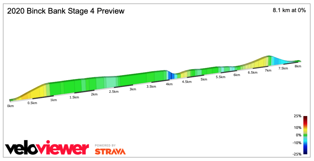 Es perfecta para que los puncheurs saquen diferencia allí, porque luego viene un ligero descenso de 3km donde difícilmente un rodador les recupere el tiempo perdido. A continuación hay otra subida, muy corta, seguida de 2 km directos y casi llanos, y una última cota de 700 m al 4%. El descenso a meta es muy veloz. En una crono de 8 km, con 2 de escalada total, los puncheurs tienen cierta ventaja.