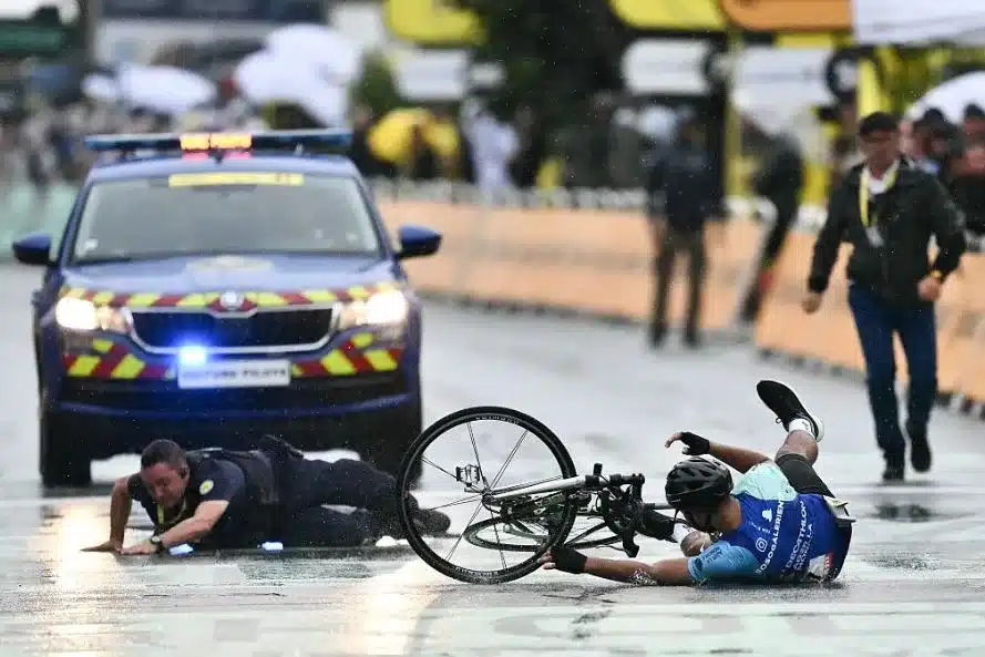 También deberá pagarle al policía que lo tacleó. Arrestan al hombre que entró en meta con su bicicleta