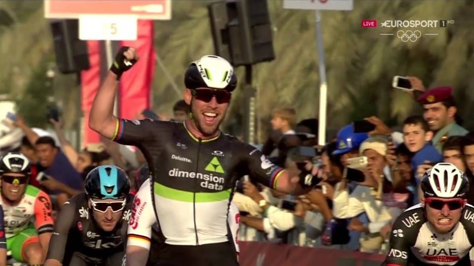 Mark Cavendish (Dimension Data) lidera el Abu Dhabi Tour tras imponerse en la etapa1, 189 kilómetros con salida en Baynounah Educational Complex y meta en Madinat Zayed, donde fue el más rápido en un caótico embalaje masivo.