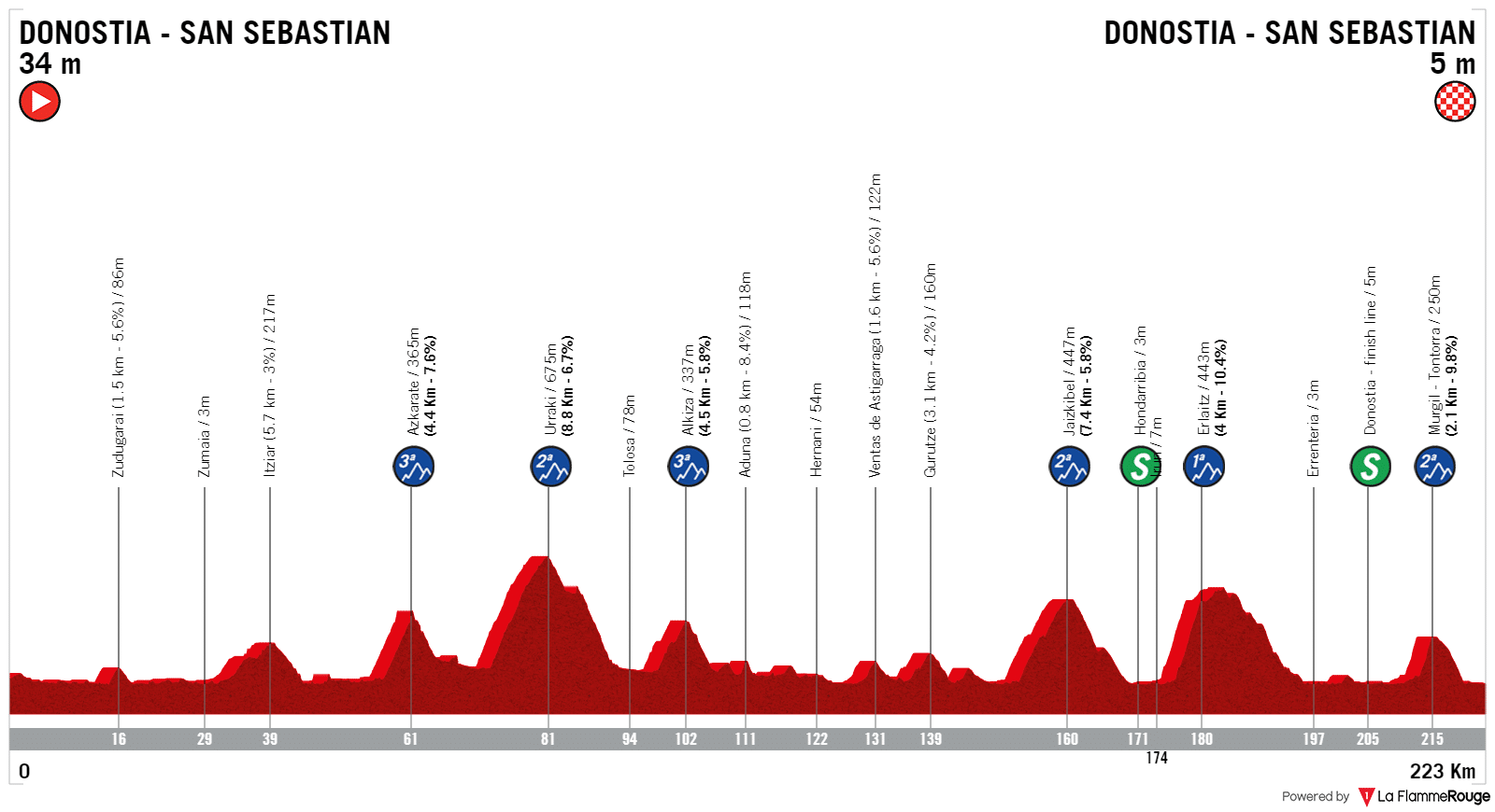 El primero es el Jaizkibel, justo a las afueras de San Sebastián y una subida que es tradicional en la carrera. Tiene 7,4 kilómetros de recorrido al 5,8% y cumbres a falta de 63 kilómetros, con una bajada bastante técnica después.
