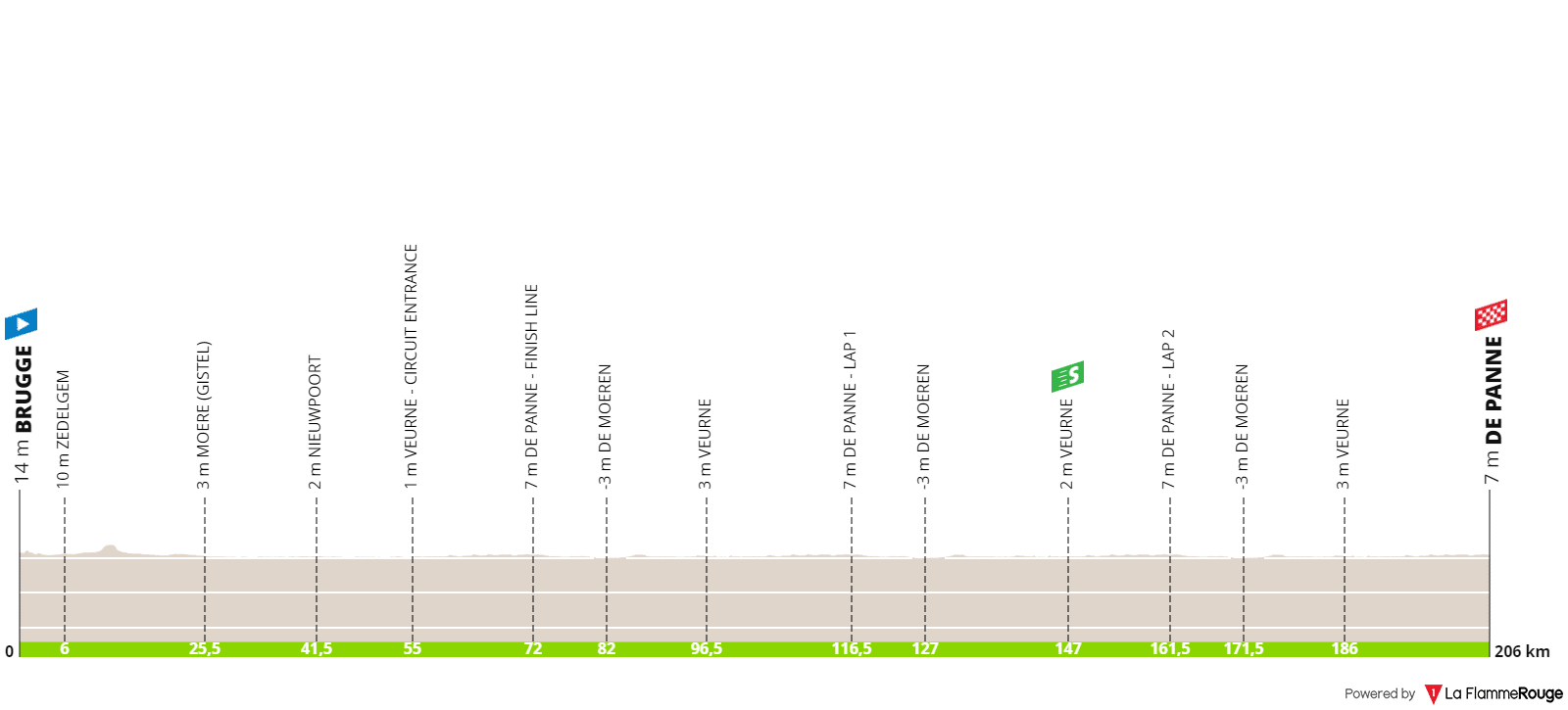 No hay mucho que abordar en esta carrera, el pelotón se dirigirá hacia De Panne donde dará tres vueltas a un circuito final por los pueblos cercanos.