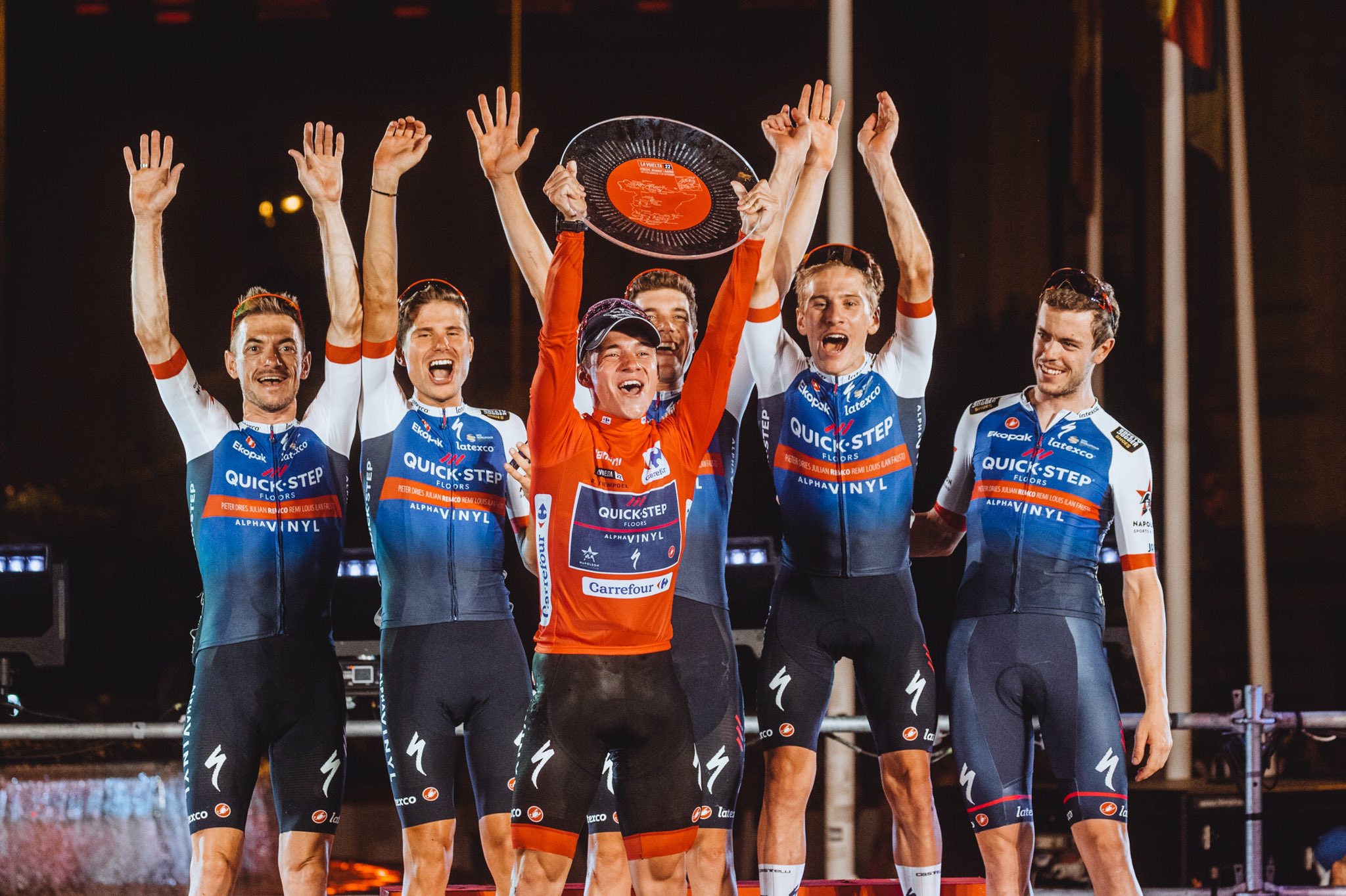Tambien escuche decir eso a lefevere.. me parece que presionarán hasta donde pueda, es un zorro viejo, estoy seguro que el recorrido este año en el Tour tendra un km alto en crono para atraer a Remco, es simple estrategia, ya se sabe que los eslovenos irían al Tour, asi como Vindergar practicamente seguro…