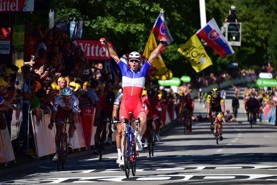 Arnaud Démare (FDJ) se impuso en la etapa 4 del Tour de France 2017, 207.5 kilómetros con salida en Mondorf-les-Bains y llegada a Vittel, donde levantó los brazos en medio de un caótico embalaje. Geraint Thomas se cayó, pero sigue líder.