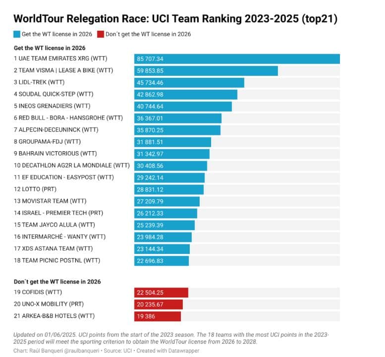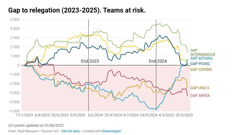 Raul Banqueri, periodista que se especializa en la situación de puntos de las escuadras, precisó que tanto Picnic como Cofidis –equipos que se juegan el último puesto- suelen sumar entre 4.000 y 5.000 puntos en las últimas temporadas desde el final del Giro hasta el cierre de la temporada.