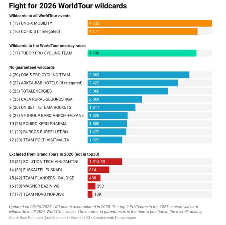 En este momento, Uno-X (4.728) y Cofidis (4.177 puntos) son quienes se quedan con invitaciones para todos los eventos WorldTour, sumándose Tudor (4.130) a las carreras WorldTour de un día. La situación es riesgosa para Cofidis en el caso de descender pues Tudor (4.130) y Q36.5 (3.863) están a los pies de los talones. Si ambos equipos lo superan, la formación francesa se quedará sin invitaciones automáticas y deberá depender de la voluntad de los organizadores: posiblemente la Vuelta a España –que tiene a Cofidis como sponsor- y el Tour de France –en el caso que TotalEnergies desaparezca como estructura- serán piadosos.