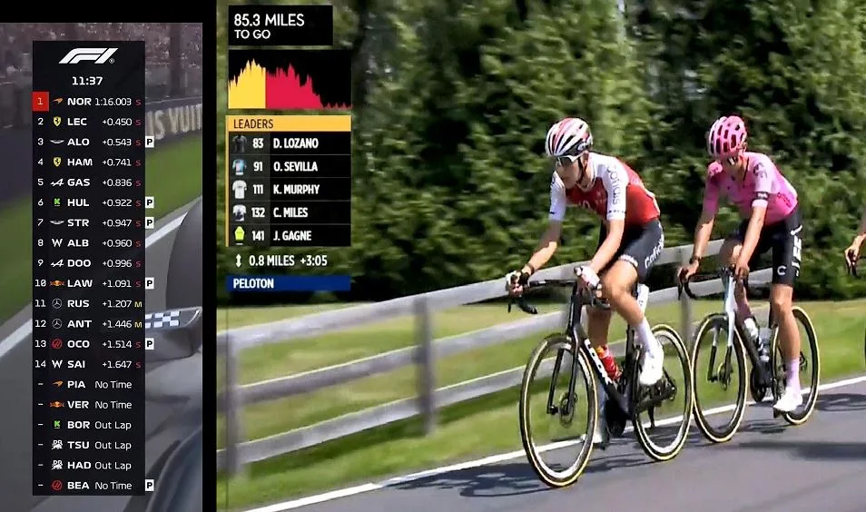 La información a la hora de seguir una transmisión de ciclismo es esencial, más considerando que, especialmente en etapas de montaña, los corredores están disgregados en múltiples grupos. Sin embargo, para los nuevos seguidores del deporte, esto no suele ser tarea sencilla. Las gráficas o zócalos no detallan quién está en cada grupo. Hay que aguardar hacia el ocasional cambio de cámara para que muestre en una esquina los integrantes del grupo que se enfoca o que los comentaristas lo mencionen explícitamente. Y para esto, se pueden esperar minutos. En la época de la inmediatez, eso no es aceptable.