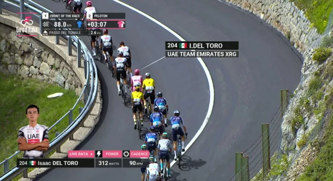Es cierto: siempre está la opción de entrar a los “race centers” oficiales o a ProCyclingStats, pero esa información tiene que estar en pantalla. Los espectadores no deberían recurrir a un medio externo para enterarse. La solución pasa por mostrar de forma permanente, o al menos intermitente, los nombres que componen cada grupo. El Giro d´Italia en su edición 2025, como se ve en la captura, comenzó a implementar de forma tímida los nombres de los ciclistas en los recuadros de tiempo y grupos, de forma permanente en pantalla. Sin embargo, se queda corto.