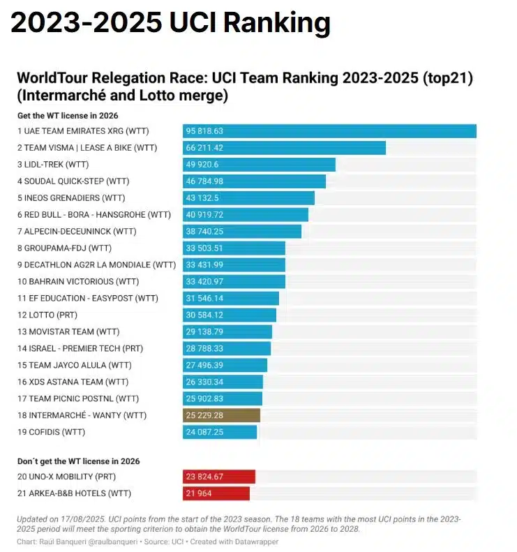 Expliquemos brevemente como funciona esto. Hay ciclos de tres años para los ascensos y descensos. El actual inició en 2023 y finalizará a fines de este año. Los 18 equipos que más sumaron puntos durante esos tres años pueden optar para una licencia WorldTour al ciclo siguiente. Ignoraremos a los mejores equipos (UAE y Visma, por ejemplo, están primero y segundos cómodos) y nos fijaremos en la parte inferior de la tabla, que sintentizó aquí el periodista Raúl Banqueri, de Lanterne Rouge.