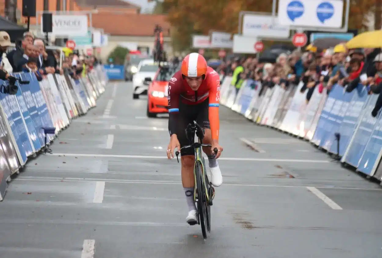 Hoy, sin embargo, pudo terminar el año con una sonrisa, venciendo en la Crono de las Naciones. Fue una contundente victoria del ciclista de 21 años en el recorrido de 45 kilómetros de Les Herbiers, en donde marcó un tiempo de 51 minutos y 12 segundos con una media de 52,6 kilómetros por hora en una ruta mojada por una lluvia ligera. Ya era el más rápido en el primer punto de control con un tiempo de 12:20, y amplió su ventaja a mitad de recorrido con un tiempo de 39:41, más de 40 segundos más rápido que un especialista como Jay Vine (UAE), segundo puesto en el mundial de crono de Ruanda, y casi un minuto por delante de Stefan Küng.