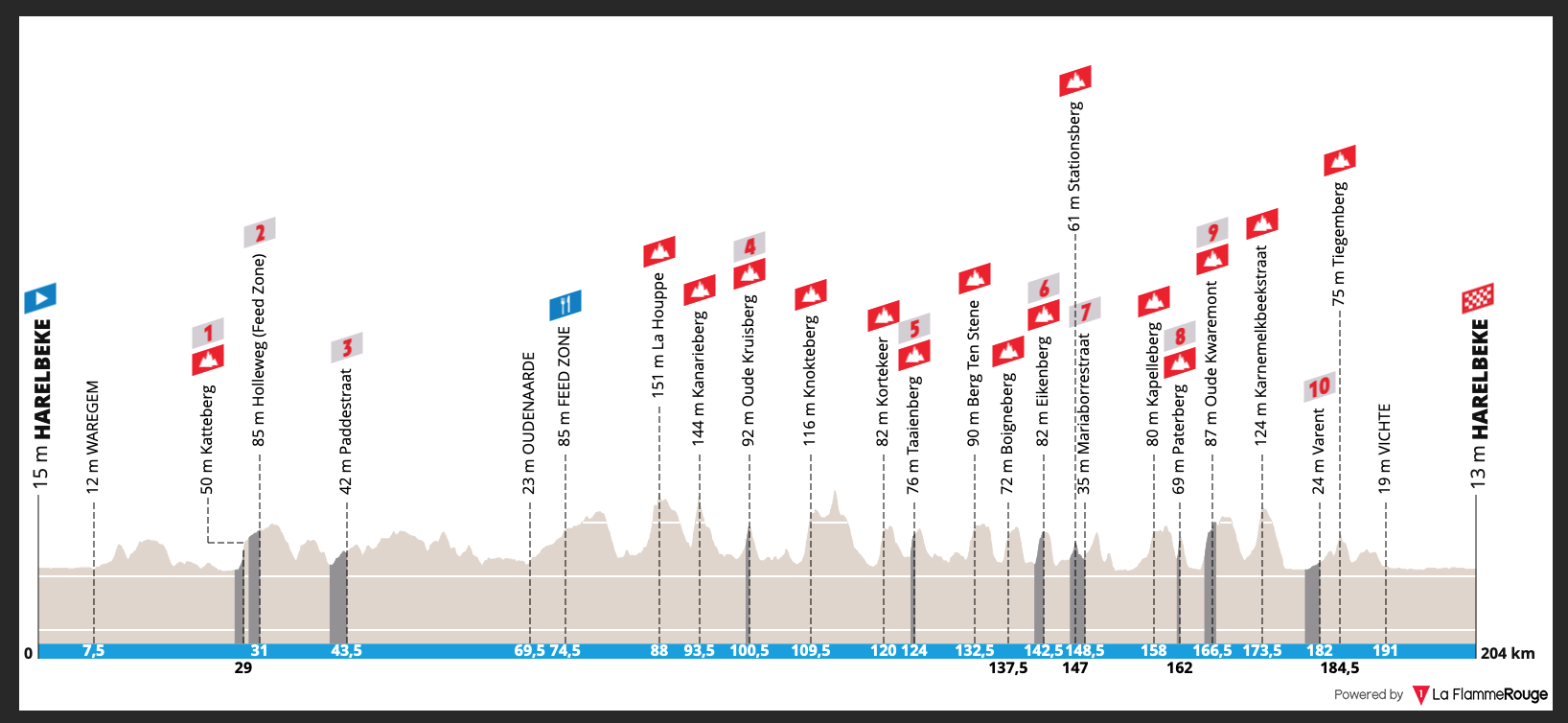 You just can’t beat the Oude Kwaremont. This is the only race where it comes after the Paterberg, giving it the respect it deserves! Steep at the bottom, but serious damage can be done at the top. Unfortunately it looks like a strong headwind for the climb, what a shame.