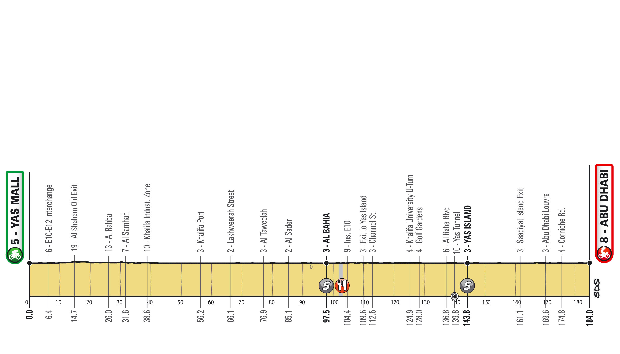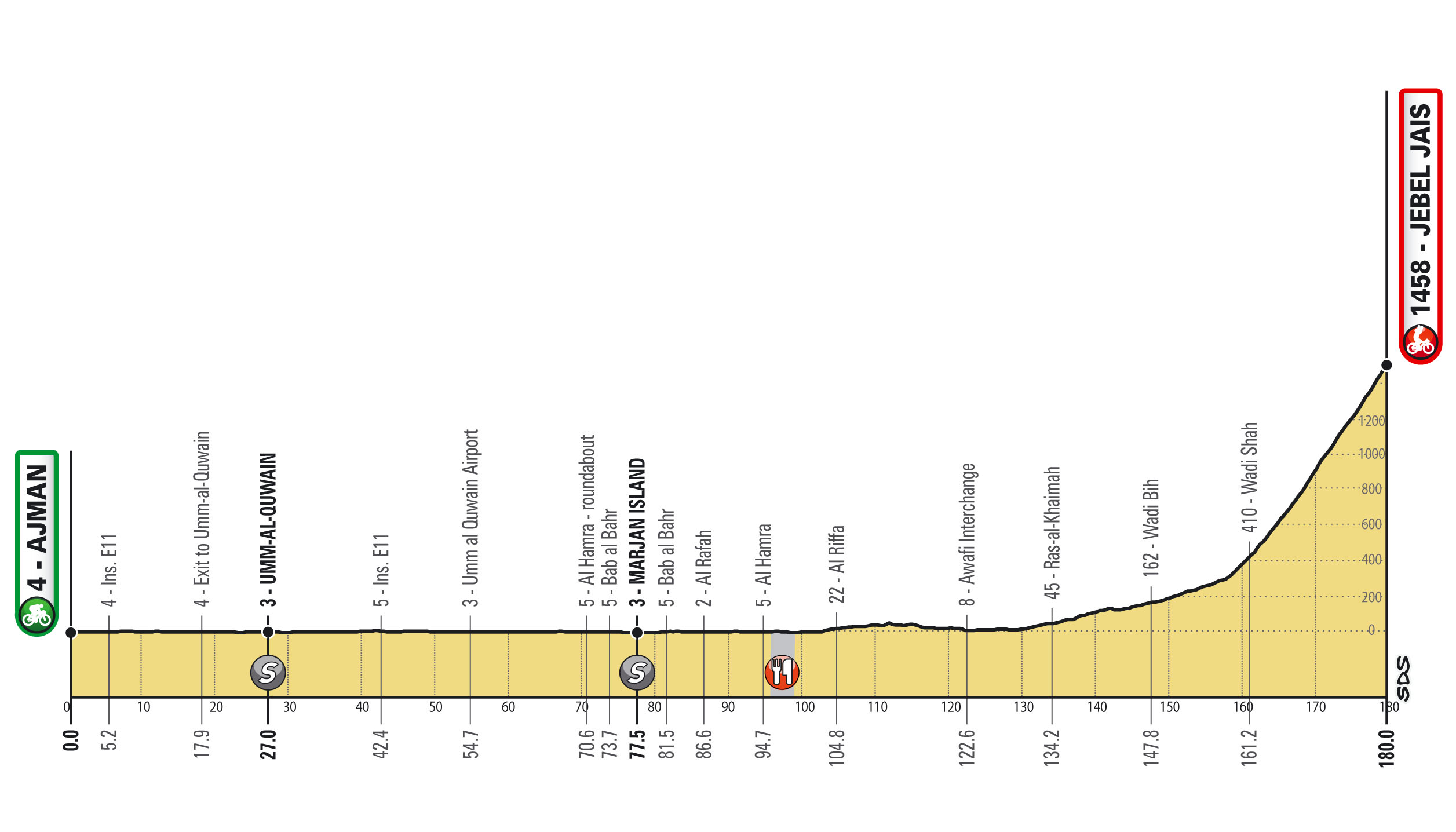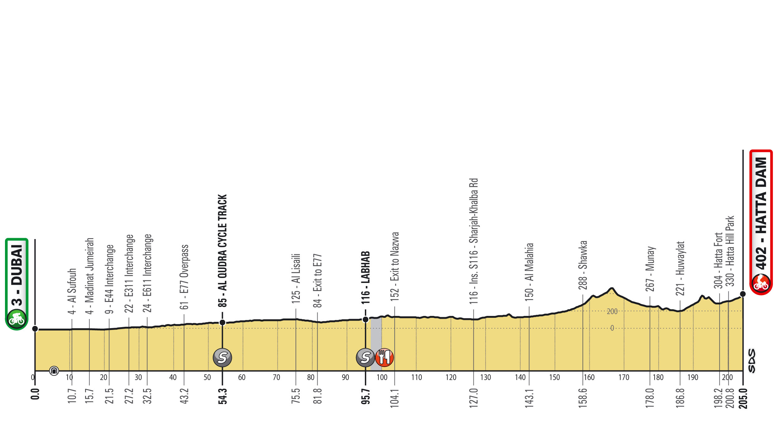 Serán siete parciales, iniciando con una Contrarreloj por equipos (CRE) de 16 km. Las demás fracciones permitirán brillar a los velocistas, excepto por los dos finales en alto para escaladores y el conocido muro de Hatta Dam, propicio para puncheurs.