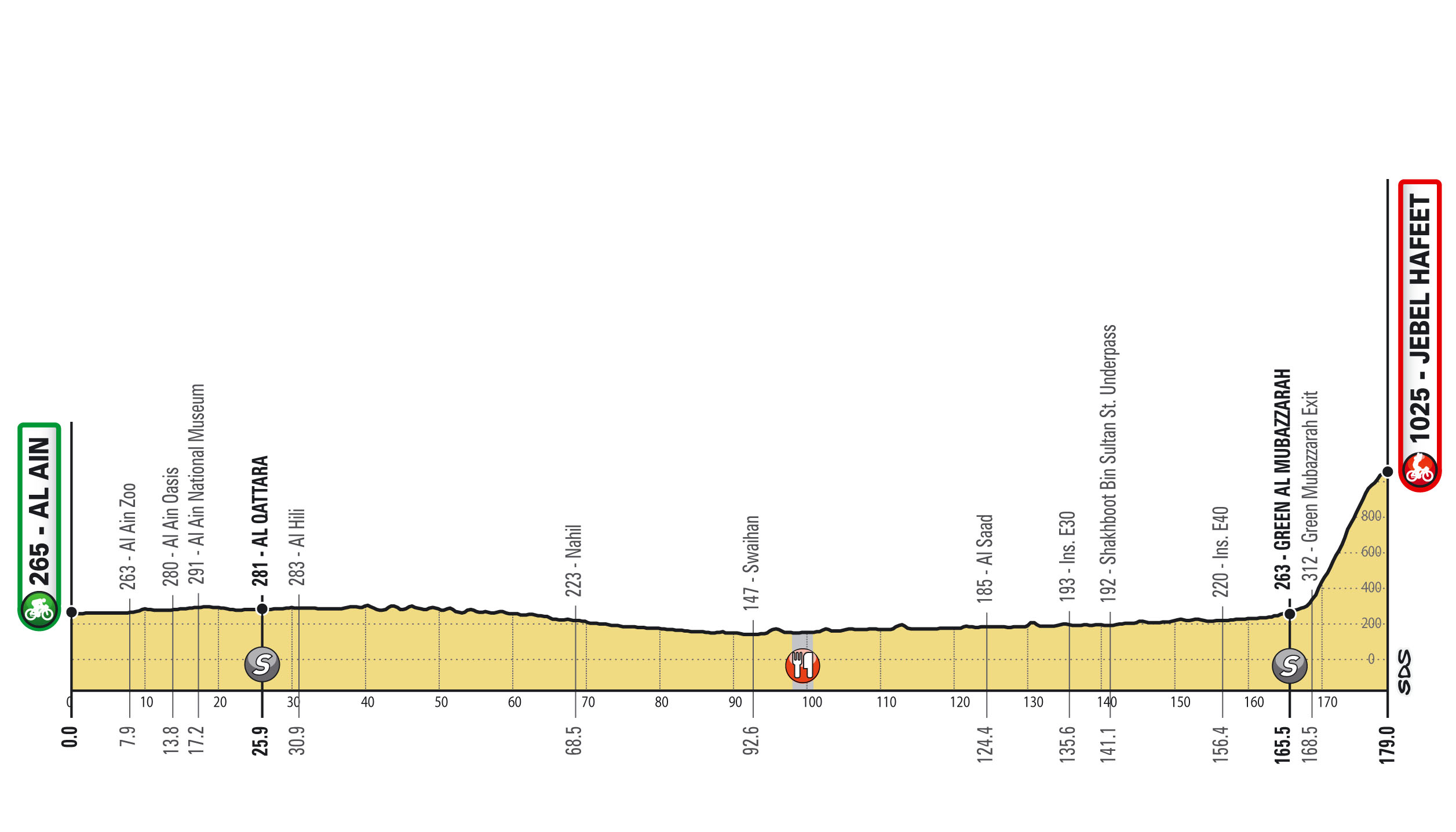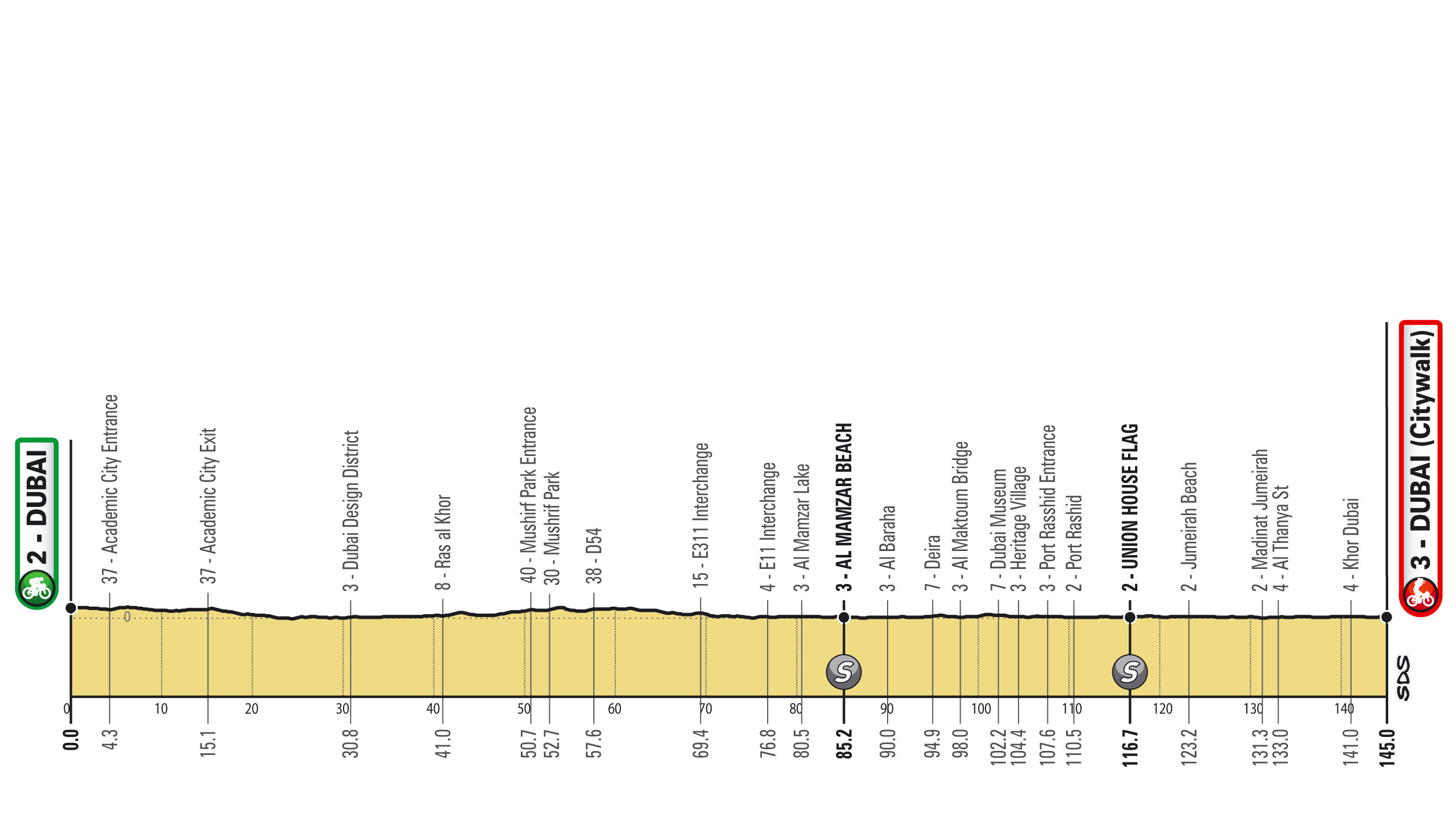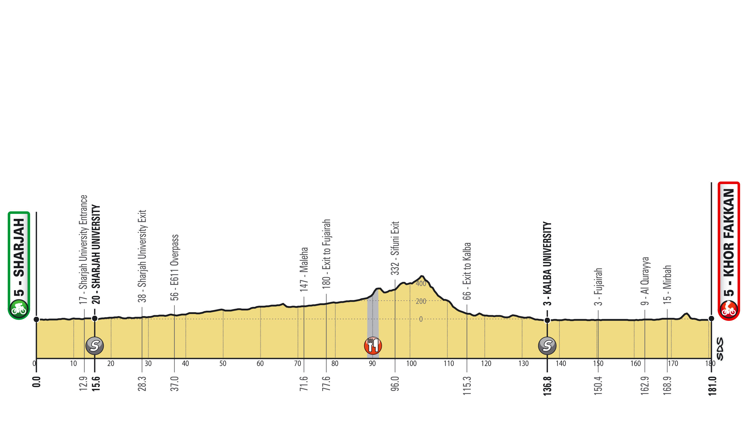 Serán siete parciales, iniciando con una Contrarreloj por equipos (CRE) de 16 km. Las demás fracciones permitirán brillar a los velocistas, excepto por los dos finales en alto para escaladores y el conocido muro de Hatta Dam, propicio para puncheurs.