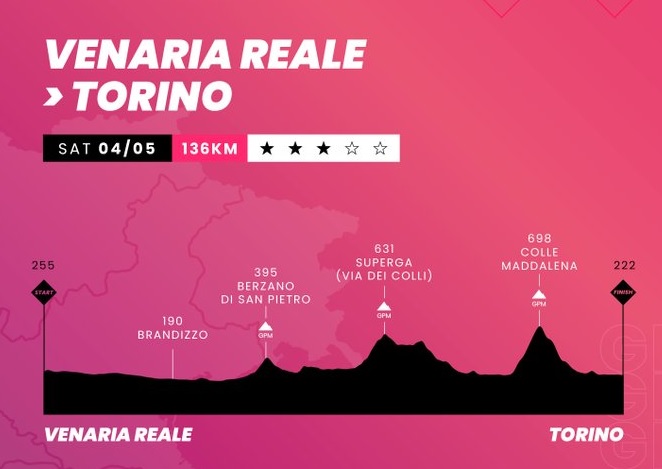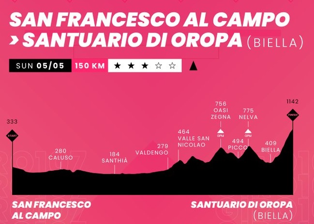La carrera iniciará el 4 de mayo con un parcial de media montaña que incluye la ascensión a Superga. Serán 136 kilómetros entre Venaria Reale y Torino y habrá tres cotas en el camino. Al día siguiente, la caravana llegará a Oropa luego de 150 kilómetros con salida en San Francesco al Campo. Dicho arribo en alto será el más temprano para la Corsa Rosa en tres décadas.