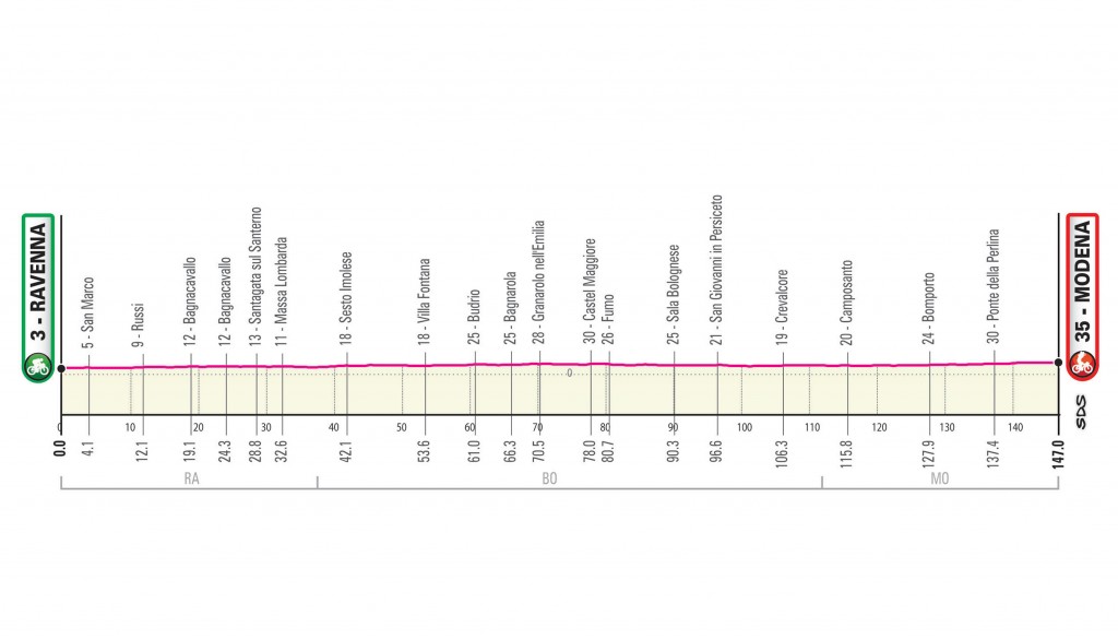 La segunda semana iniciará con un trazado de 147 kilómetros entre Ravenna y Modena. Se cruzan diferentes lugares como Lugo, Massa Lombarda, Granarolo nell’Emila y Crevalcore. Luego sigue el acercamiento rápido y completamente plano a la ciudad de Modena y hasta la llegada en sprint masivo para el grupo compacto. Mientras que, al dìa siguiente, la jornada partirá desde Carpi.
