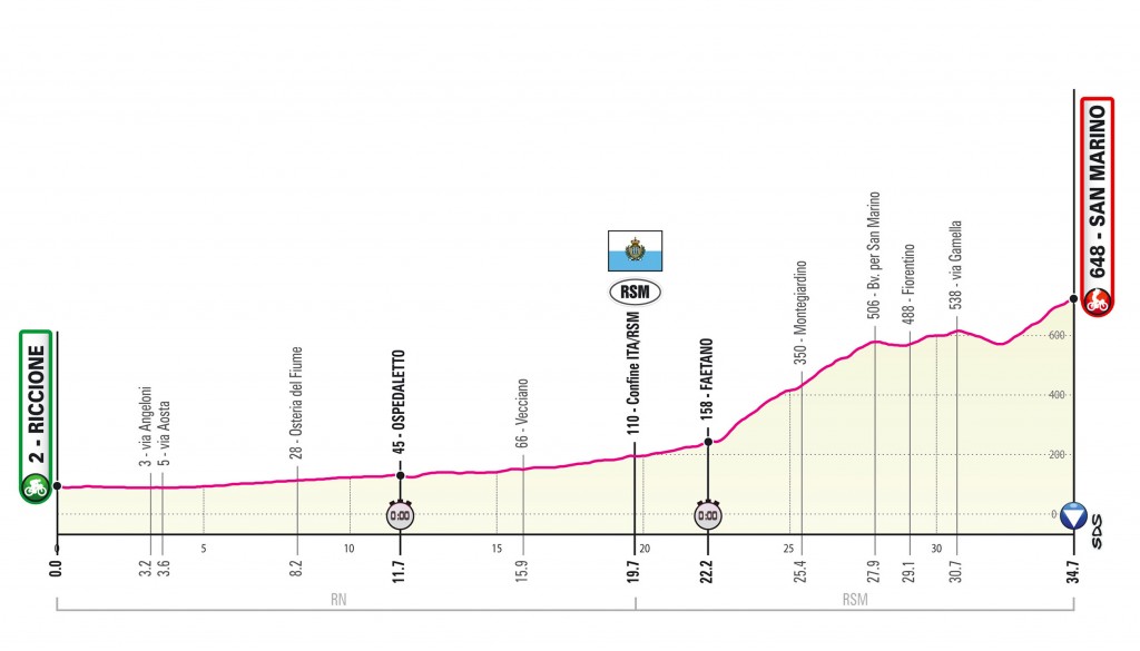 Entre las diversas confirmaciones, se oficializó la 9° etapa, otro tramo cronometrado individual. Esta vez, serán 34.7 kilómetros los que unirán Riccione con San Marino. Contará con una primera parte ondulada hasta la entrada en el territorio de la República de San Marino (RSM) y la segunda parte en cuesta arriba hasta la llegada. Se continúa por caminos bastante articulados y ondulados hasta llegar a Faetano, tras cubrir los primeros 22 km. Después de Faetano el recorrido conduce a una pendiente de dos cifras que hasta Fiorentino. Desde allí hasta la llegada, la altimetría tiene secciones ascendentes que se alternan con contrapendiente corta. En general, es un ascenso para un passista-escalador.