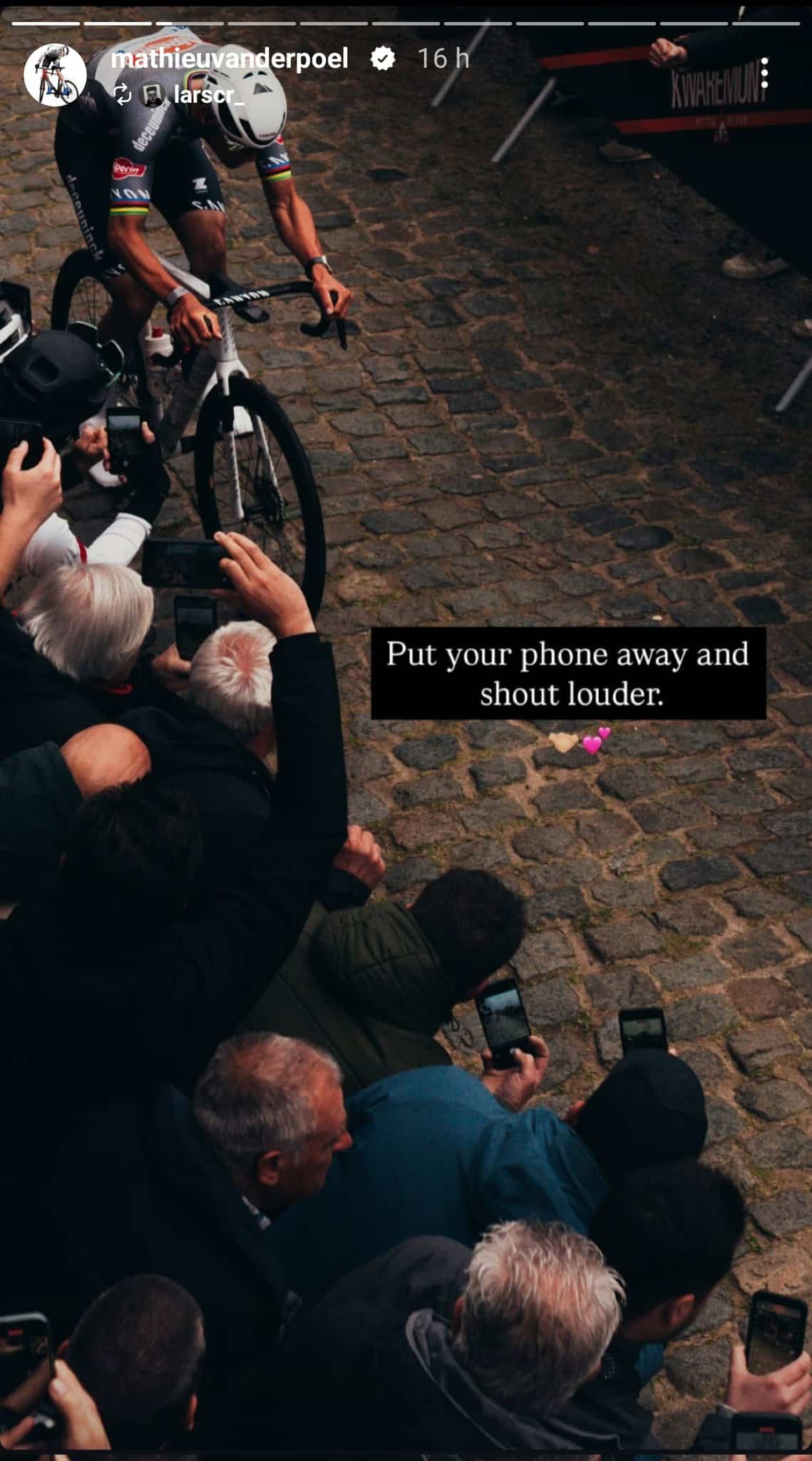 Una costumbre que se volvió generalizada en los últimos tiempos, no solo en el ciclismo sino en todos los ámbitos, es que se grabe con el celular, ignorando con sus ojos la acción y el momento que están viviendo. En este caso, una fuga de un deportista de elite que pocas veces se ve en la historia como es el neerlandés del Alpecin. En muchos casos, además, esto derivó en accidentes de corredores chocando contra los dispositivos. En Instagram, publicó una historia en donde, adjuntando una foto donde se ve a todos los espectadores con celular en mano, comparte un mensaje en donde se pide “apartar” estos apratos y, en lugar de eso, “gritar más fuerte”.