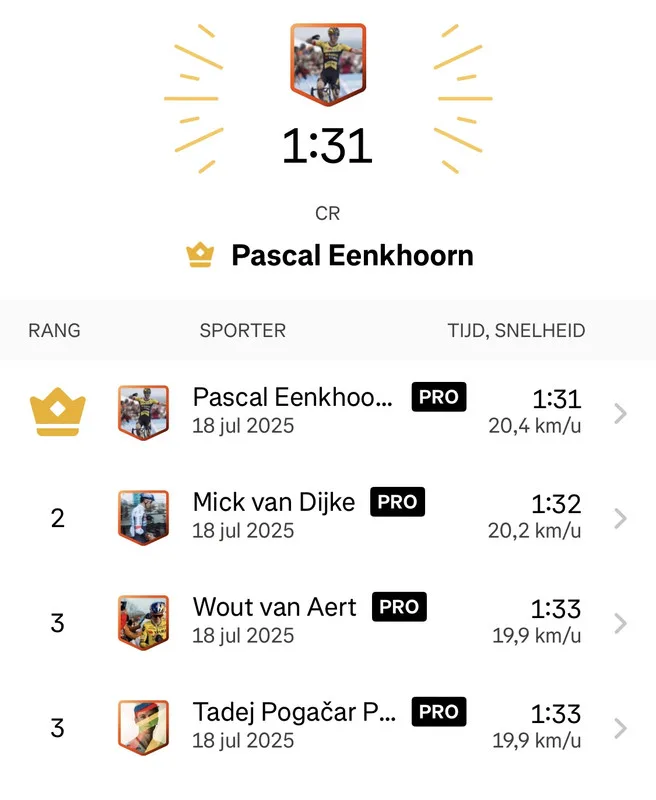 Eenkhoorn fue el más rápido con 1:31 (a 20,4 km/h), segundo Mick van Dijke (1:32) y tercero Wout van Aert (1:33). “Deberías preguntarle mañana a Sweeny qué le pareció cuando fui tras él. Se debe haber preguntado “que cosa está haciendo”. Estaba detrás de mí, y le dije: “Daré con todo por esa barbacoa”, y le pareció fantástico. Y me dijo: “Te voy a animar en ese tramo”, indicó.
