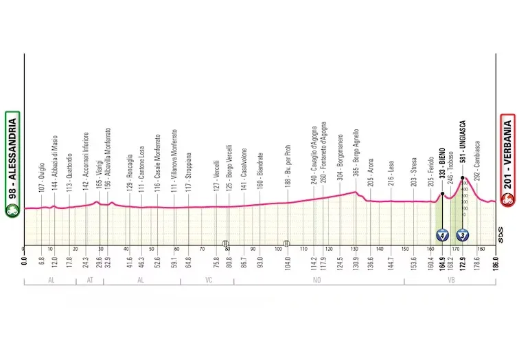 Hay un par de cotas, lejos de meta como para tener un impacto real. Los sprinters pueden hacer suya la jornada, llegarán con varias fracciones rodando a cola de grupo, reservando energías. Solo un Mads Pedersen con su equipo a bloque puede romper el guión si decide endurecer para tener un día para velocistas rocosos.