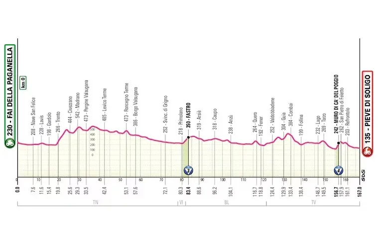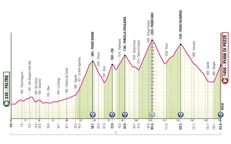 La etapa reina merced a los más de 5000 metros de desnivel globales y los encadenados de entidad dispuestos: Passo Duran, Coi, Forcella Staulanza, Passo Giau y Passo Falzergo. Un día a lo “Giro”, con subidas largas, en altura, y posiblemente con mal clima (que ojalá no elimine ninguna ascensión).