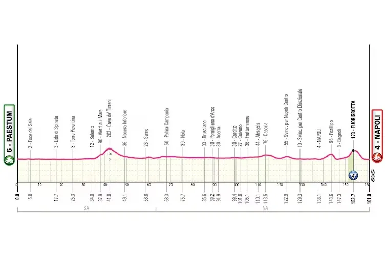 Nueva posibilidad para los sprinters, que ya han tenido suceso antes en Napoli. Los trenes deberán estar atentos a la cota que se corona a 7 kilómetros de la llegada.