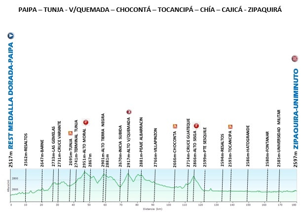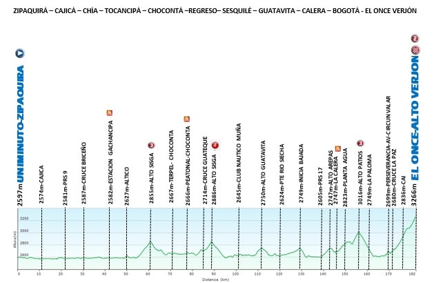 En respuesta al tweet de Pablo Palermo, la subida al paramo el verjon se encuentra en buen estado, recientemente fue pavimentada la primera parte del puerto y la parte final que presentaban fallas geológicas,. En cuanto al clima es muy impredecible, además de que en la parte final el viento en ocasiones es un factor de bido a la ausencia de árboles, es bueno también mencionar que de la altimetria que se muestra en la imagen, solo se recorren los 12.5 primeros kms que es donde termina la etapa en el parador el Márquez del 11, el paramo como tal esta unos 6km adelante a una altura de 3376 msnm. Espero sea de su ayuda. Saludos