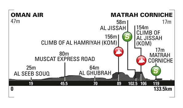 By David Hunter Oman Air – Muttrah Promenade 133.5km After the disappointment of stage 5, we end the race with a sprint. The two climbs in this stage have already been covered in the race. Both these climbs are the ones used on stage 2, where Cancellara took the stage. The big difference is the length…