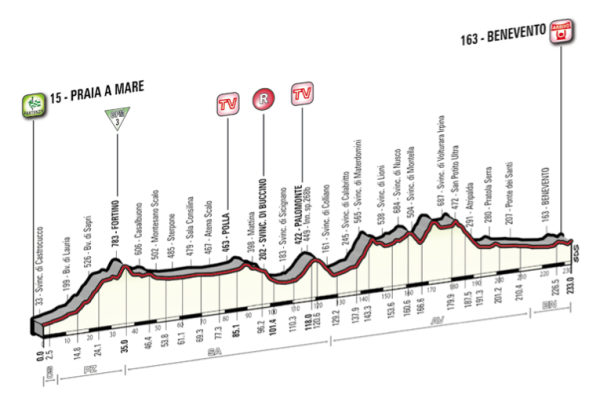 By David Hunter Praia a Mare – Benevento 233km A long stage, the second longest in the whole race. It’s one of those stages that is harder than the profile suggests.