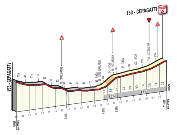 By David Hunter Castelraimondo – Cepagatti 216km After the cancellation of the Queen stage, this seemingly innocent looking stage will see some fierce fighting. I’ll cut straight to the chase, the need for bonus seconds will kill the hopes of any breakaway rider. This is all about the last 30km.