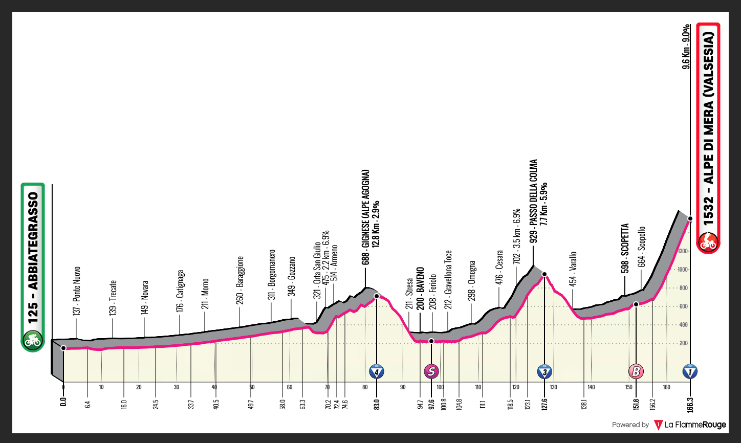 Por David Hunter Abbiategrasso > Alpe De Mera 166.3km Debido a la reciente tragedia del teleférico, la ruta fue modificada y es más fácil que la original. Nada sucederá antes del último puerto, una pena, pero hay que decir que la ascensión conclusiva es brutal.