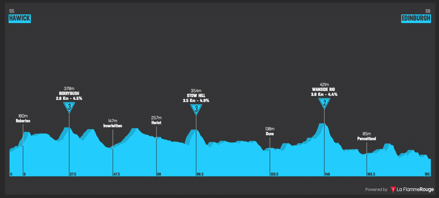 Por David Hunter Hawick > Edinburgh 195km Con 2536 m de desnivel, no es una etapa plana, pero debería ser nuestro primer gran sprint de la carrera. Tenemos tres subidas categorizadas, ninguna de las cuales es particularmente dura. Es difícil ver que la etapa no termine en un sprint.
