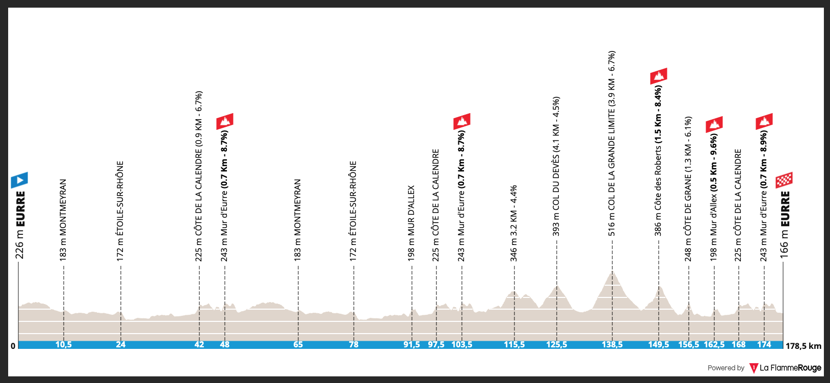 Por David Hunter Eurre > Eurre 178.5km Luego de la divertida jornada de hoy en Faun Ardèche Classic, los corredores volverán para el round 2. Drôme Classic es mucho más sencilla que Ardèche, tiene sólo 2290m y son 179km. La primera mitad es fácil, pero la segunda se endurece.