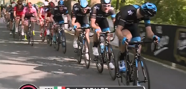 Por eso no fue raro verlo unos kilómetros antes a rueda de Sky, cuando se viajaba a toda velocidad rumbo al desenlace y su rosado atuendo contrastaba notoriamente con el negro de los británicos que trataban de provocar un corte.
