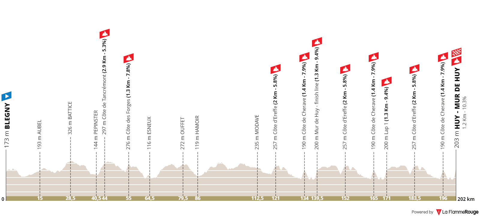 En la última vuelta tenemos la Côte d’Ereffe con 2Km al 5,8%, que corona con 19,5 kilómetros para el final. En cuanto a la Côte de Cherave, llega a la cima con solo 6 kilómetros para el final, lo que puede abrir un poco más la carrera. Son 1,5 km al 6,9 % y presenta gradientes de dos dígitos, no es una característica fácil. Seguirá un pequeño descenso y una rápida subida a Huy, hasta la última ascensión.