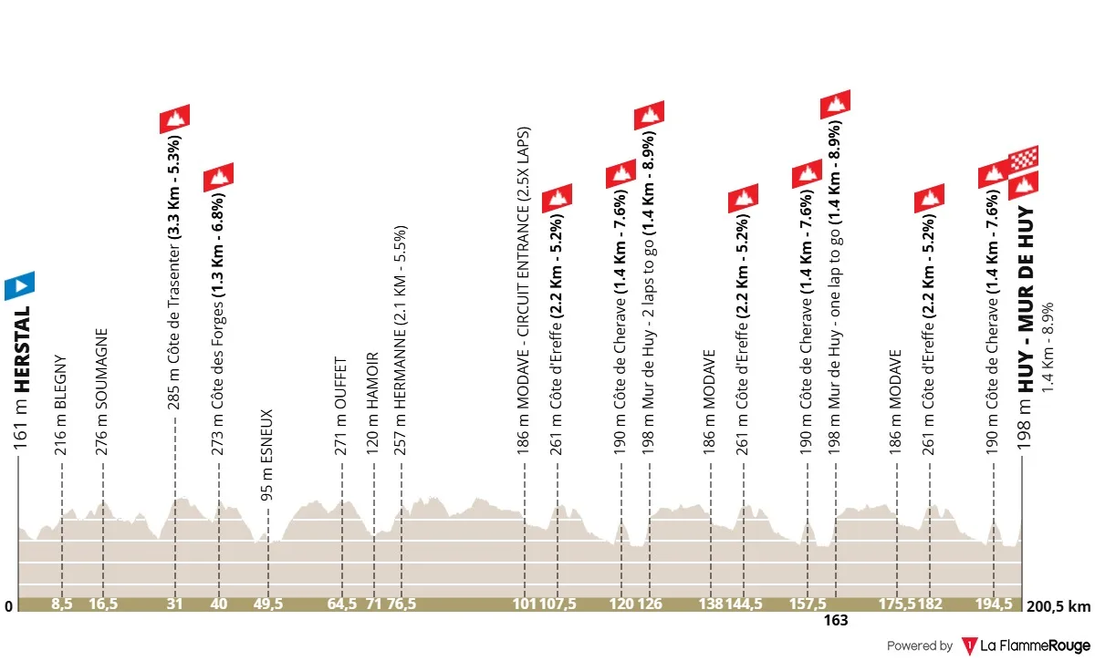 La edición 2026 presenta un trazado de 200 km que incluye 11 cotas categorizadas pero una enorme cantidad de colinas sin categorizar, para un total de 2974 metros de desnivel positivo. El trazado consiste en unos primeros 100 km con apenas dos cotas catrgorizadas pero en terreno quebrado, para luego ingresar a una circuito que tiene las que serán las cotas claves, amén del Mur de Huy.