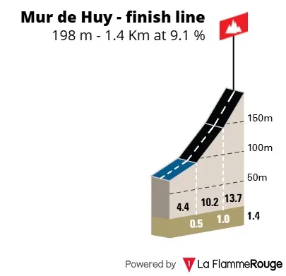 Poco que describir: con prácticamente toda la subida es en doble dígito, terreno en el que unos pocos pueden hacer diferencia en el mundo. Por ese arribo y lo poco selectivo del recorrido previo, no son muchos los que intentan algo diferente y la mayoría se reserva pensando en un embalaje de puncheurs.