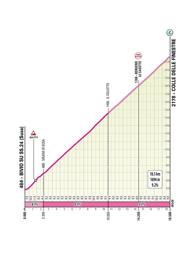 Al concluir hay otros 6 km aplanados, pero con una ligera tendencia al ascenso y que nos acercan a la última escalada puntuable de esta edición: Sestriere (2°).