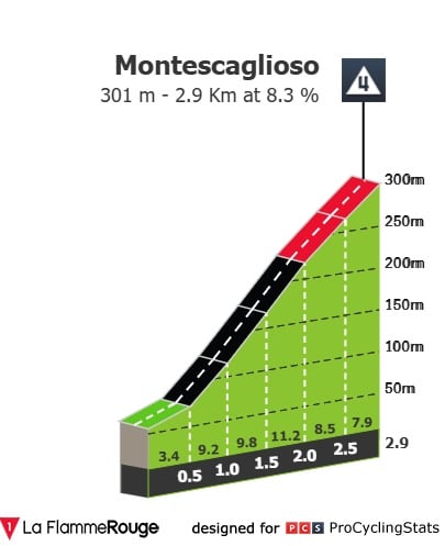 Cuando resten 31 km a meta el grupo se va a dinamitar. Es allí donde inicia la breve, pero explosiva escalada a Montescaglioso (4°). A primera vista parece una cota a ignorar por su categorización -que en este Giro es algo imprecisa-, pero los detalles son serios: 2.9 km al 8.3%. No es un puerto de paso cualquiera.