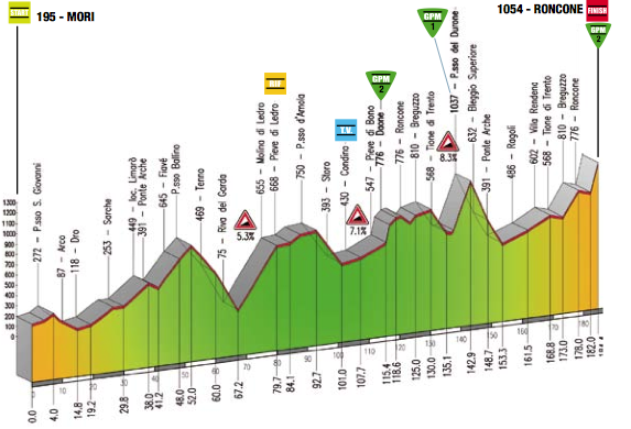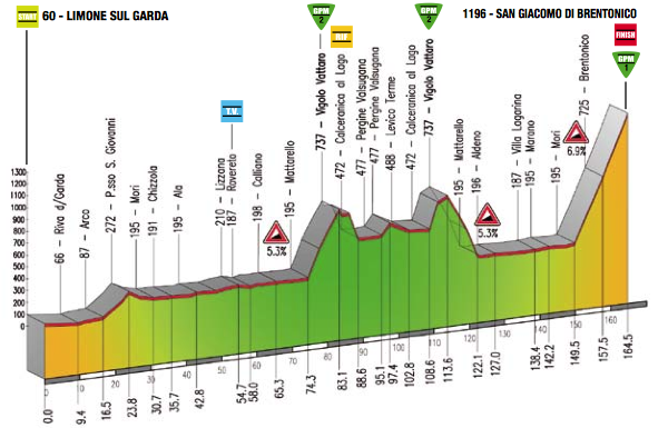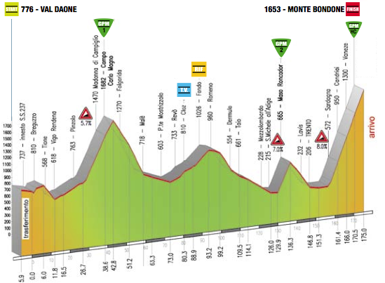 I have just looked at the road book for Trentino. It is brutal! 3 mountaintop finishes with extremely high gradients.Stage 2 ends with San Giacomo di Brentonico, stage 3 ends in Roncone with 2.4km at 14% and then stage 4 ends with Monte Bondone, 21.5km at 6.3% with 38 hairpin turns. What do you think of this?
