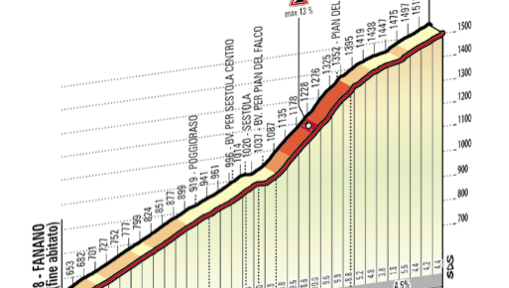 The riders have 110km of flat roads to start the stage and expect the morning break to get a big lead. We then have the cat 3, Sant’Antonio, 13.3km at 3.8% . The cat 4, Rochetta Sandri, is 8km at 3.6%, a short descent leaves the riders at the foot of the final climb.