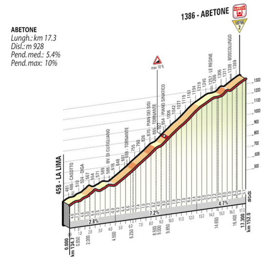 The middle section of the climb, 8km at 7.2%, is hard enough to eliminate riders, as long as it’s raced fast. Going on the last couple of days, it seems that a fierce pace will be set and it will be a battle between the GC elite. After today, it’s clear that Aru, Contador or Porte will win this race. This should be another battle between them. They all have strong teams and should have some teammates left, in the closing stages. The likes of Cataldo, Landa, Rosa, Kreuziger, Konig and Nieve might just have their day, if given some freedom.