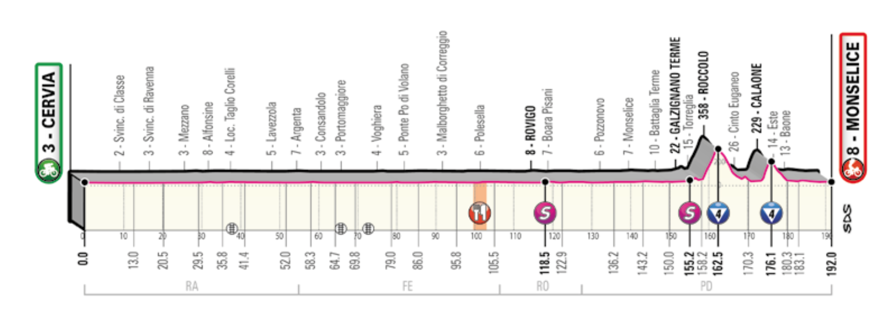First up is the cat 4 ascent to Roccolo, it is 3.7km at 7.5%. The opening 800m averages 10.2% and the road is incredibly narrow. Once over this section, the bunch move onto a wider road, which is better for the quick men.