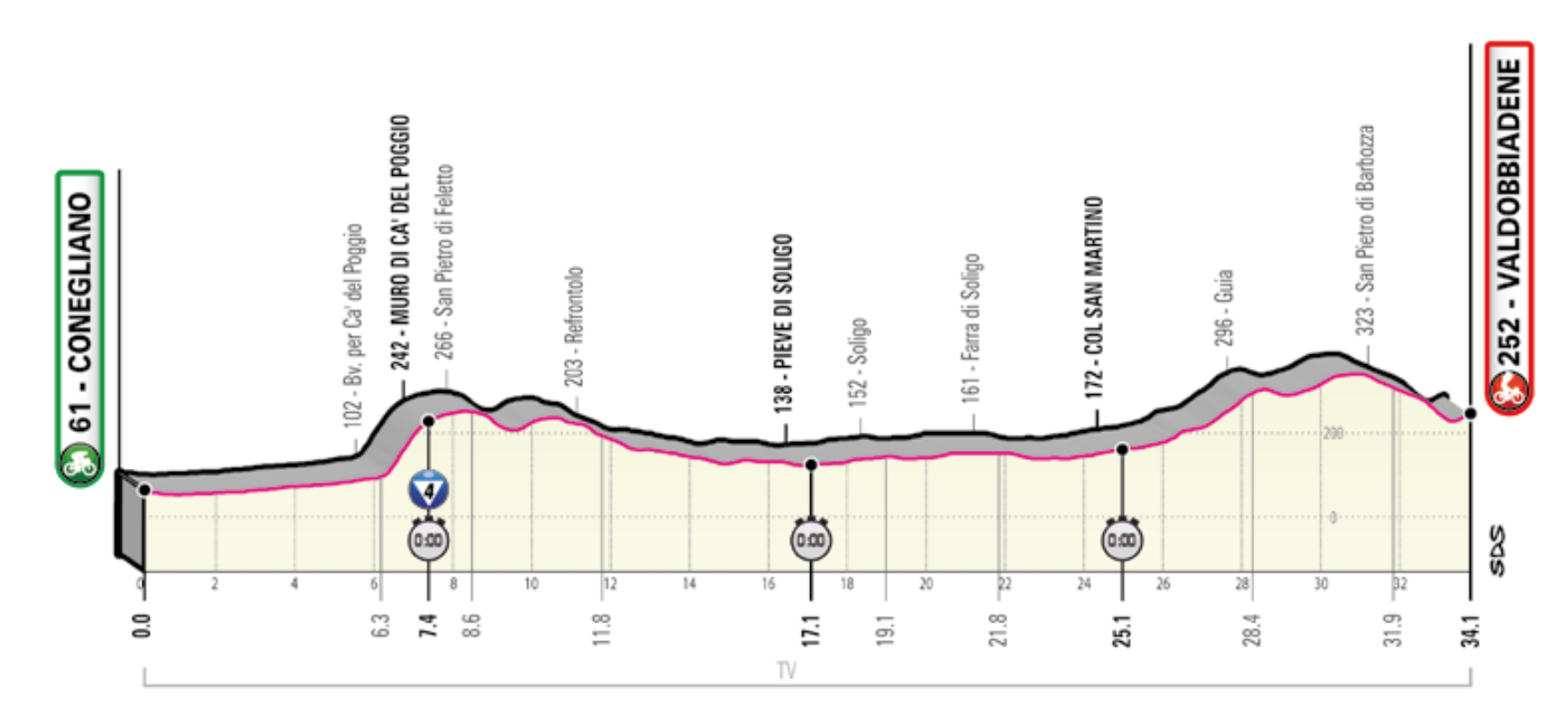 This is a day for the specialists, despite a few lumps along the way. The hardest of the climbs comes after 6km, it is nearly 1km at 12%. After this is dealt with, the riders can settle into a nice rhythm and start grinding the big gear. The final 7km then turns lumpy, with three kickers to deal with. They are 1.5km at 6.5%, 1.4km at 3.7% and 300m at 5%, which takes the riders to the finishing line.