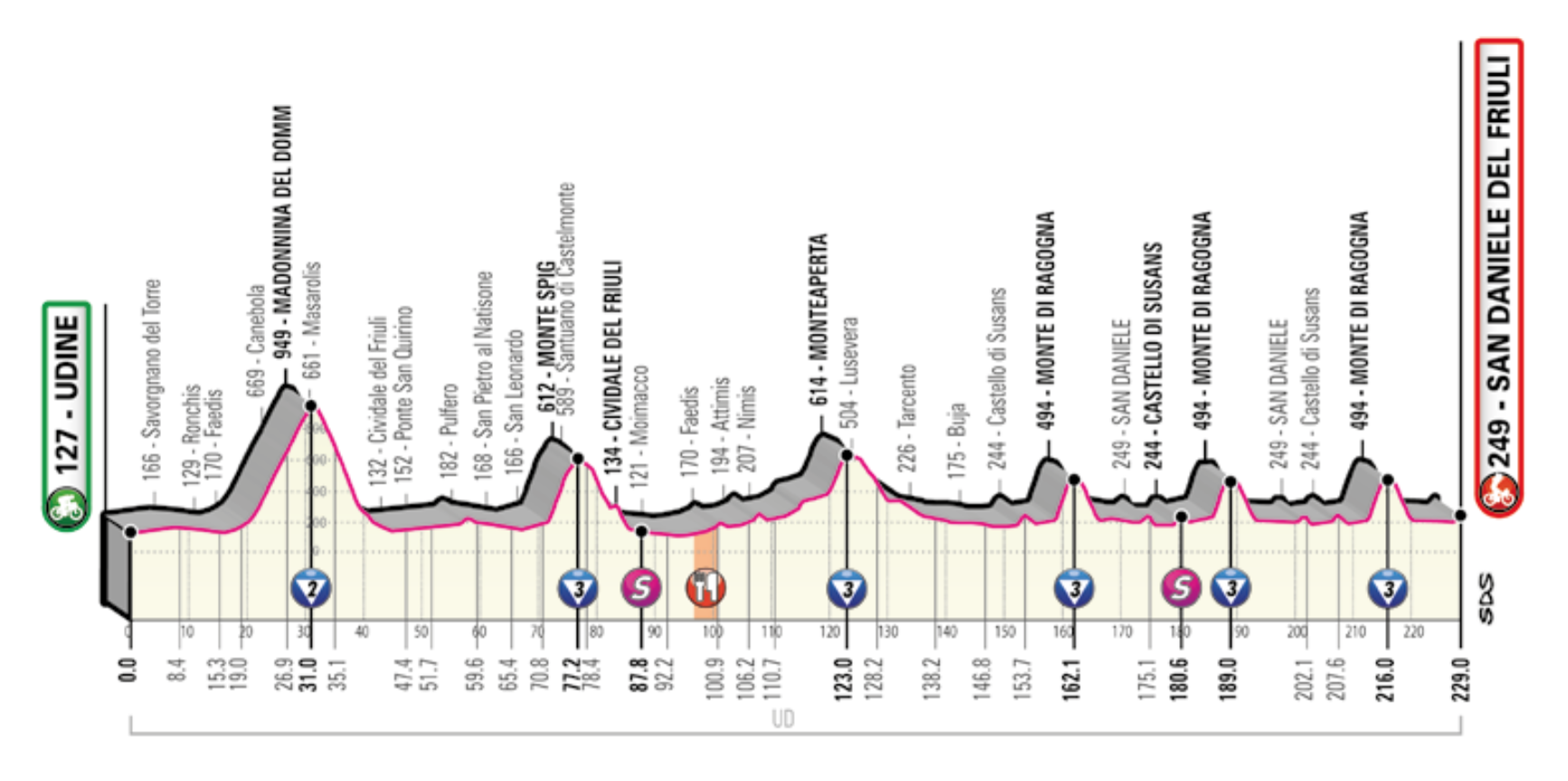Monte di Ragogna is 2.6km at 10.1%. Those figures don’t actually do it just, it is a horrible little climb. The bunch will climb it three times, which will blow the peloton to pieces. The final ascent comes with just 13km remaining. This isn’t the only difficulty in the lap circuit, there a couple of little walls that the riders also have to negotiate.