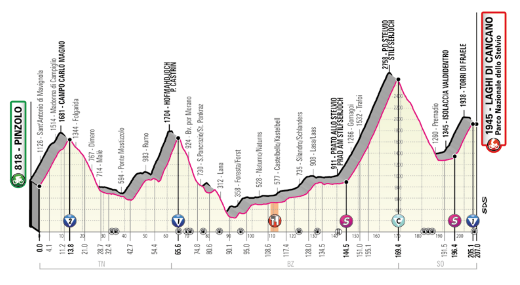 The Stelvio, one of the mythical cycling climbs. It goes all the way up to 2758m above sea level, which will put some riders into a huge amount of difficulty. It is 24.7km at 7.5%, it’s long and demanding. The crest comes with 37km to go, but it will be attacked and raced like the last climb of the whole Giro.